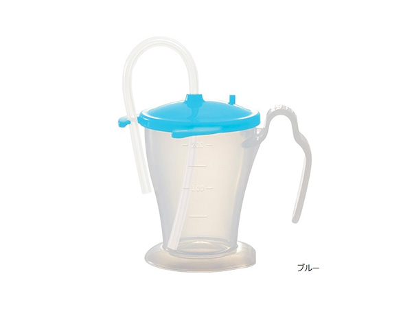 「PH ストローカップ」は、ベッドの柵に掛けられるうえ、手にフィットする2段階の持ち手つきのこぼれにくいカップです。