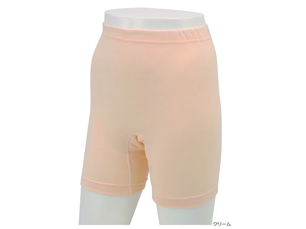 ヒップから太もも上部までを包み込む丈感で、冷房や冬場の冷えから下半身をやさしく守りながら、5層構造の吸水布が40〜50cc程度の尿もれをしっかりキャッチします。吸水部には消臭・抗菌効果のある素材を採用しているため、においが気になるシーンでも安心です。